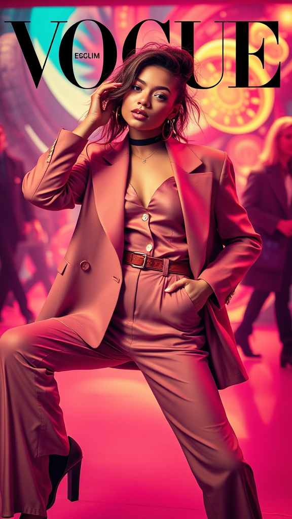 Vogue Magazine Cover, posed candidly in a modern ensemble, vibrant photoshoot, dynamic studio lighting, imaginative and surreal background, contemporary fashion aesthetic, chic and stylish vibe, effortless elegance.