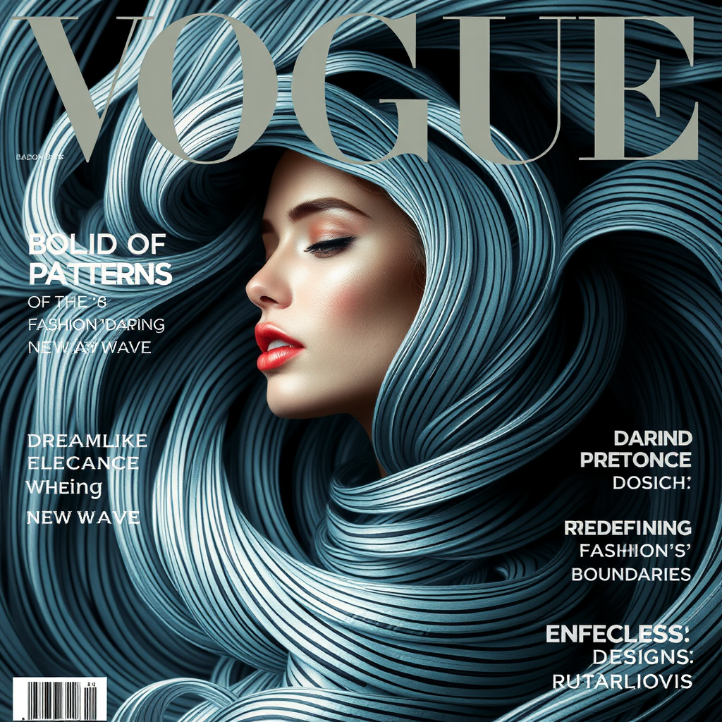 VOGUE magazine cover showcasing an enchanting woman enveloped in a dynamic whirlwind of swirling patterns. The lines curve and spiral around her, seamlessly merging her silhouette into the fluid, surreal motif. Her expression is serene, partially obscured by the mesmerizing waves of patterns, giving her an ethereal, otherworldly allure. The VOGUE logo is prominent at the top, gleaming against the intricate backdrop. Cover highlights include: "The Bold Appeal of Patterns: Fashion’s Daring New Wave," "Dreamlike Elegance: Where Art Meets Style," "Endless Designs: Redefining Fashion's Boundaries."
