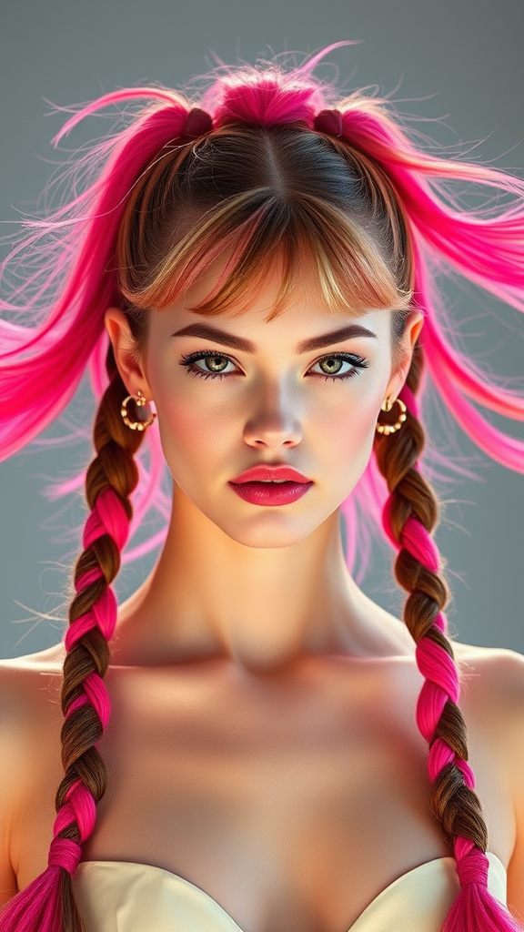 Vogue runway model featuring flowing long pigtails styled with vibrant candycore hues, fair porcelain skin, and soft blush-pink lips, exuding a whimsical and playful charm in a bold and colorful fashion.