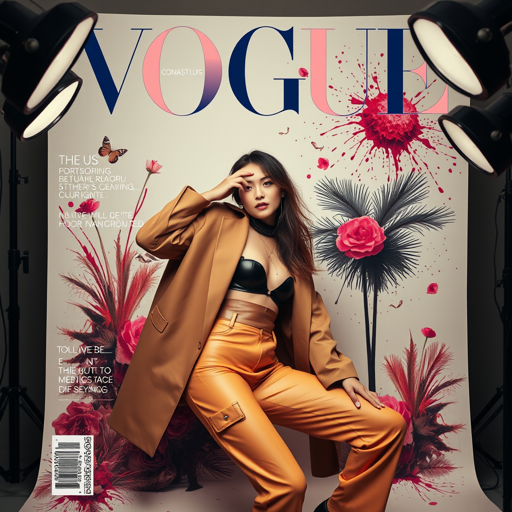 Vogue-style magazine cover featuring a model in a candid pose, adorned in high-fashion attire, captured in a photoshoot utilizing studio lighting. The backdrop boasts a creative and surreal aesthetic with a splash of vibrant, trippy elements, while the model embodies a modern and chic look.