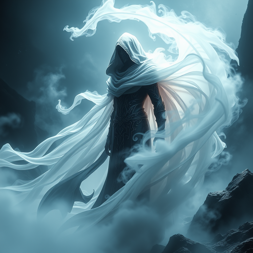 Void arcanist in a swirling cloak of mist, standing amidst an ethereal landscape, photorealistic features enhanced with intricate patterns, rendered in octane and unreal engine for hyper-realism, captivating details in every fold and shadow, enveloped in dramatic volumetric lighting that casts a mystical glow across the scene.