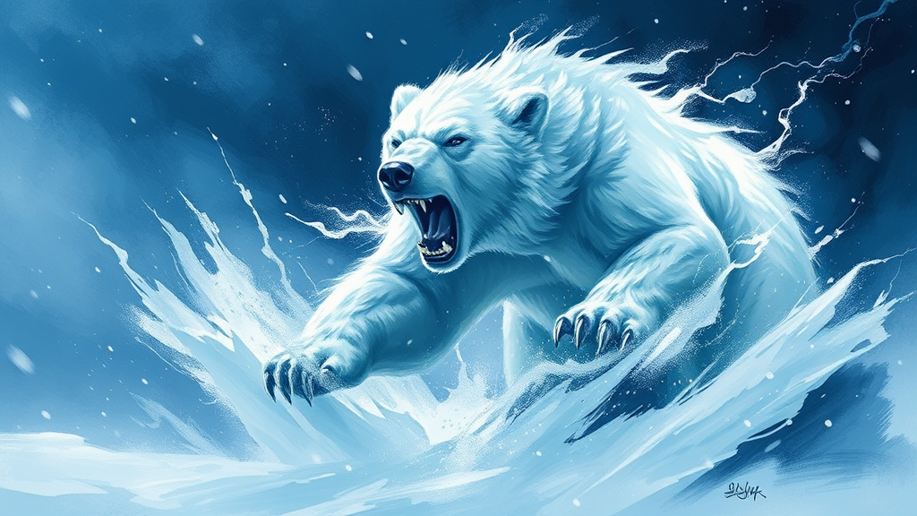 Volibear, the ferocious thunderous bear depicted in a mesmerizing artwork, ethereal hues of snowy white contrasted with deep azure, masterful brushwork captures dynamic power, dragoncore essence permeates the scene, reminiscent of James Paick's imaginative landscapes, movement frozen in time yet alive, evoking the serenity and intensity of Michael Malm’s style, a low resolution portrayal invoking ancient legends.