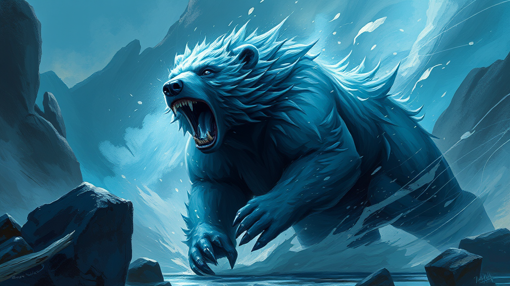Volibear, the frenzied bear depicted in a surreal painting, embodies a fusion of dark alabaster and azure hues, showcasing masterful brushwork. The artwork intertwines dragoncore elements with the dynamic energy of frozen motion, reminiscent of James Paick's atmospheric storytelling and Michael Malm's emotive strokes. The scene captures Volibear's raw power in a mythical landscape, with a low-resolution aesthetic that adds an ethereal, dreamlike quality.