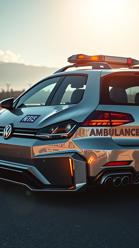 Volkswagen Golf car transformed into a futuristic robot style, blending elements of an ambulance with intricate electronic circuitry and glowing neon accents. Bathed in sunlight, the scene offers a sweeping panorama, showcasing a metallic sheen with exceptional detail and high resolution in 4K.
