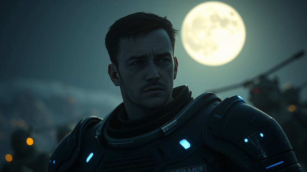 Volodímir Zelenski depicted as a futuristic soldier bathed in moonlight, with the glow of distant warfare illuminating the background. His armor emits a subtle blue luminescence, set against a shallow depth of field with volumetric lighting. The scene is cinematic, showcasing intricate detailing and ultra-realistic textures, capturing the tension and resilience of a leader from another era.
