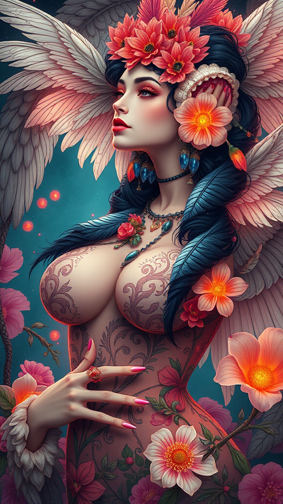 Voluptuous concubine adorned with feathers and flowers, inspired by the intricate styles of Ernst Haeckel and Maria Sibylla Merian. Influences from Tristan Eaton, Victo Ngai, Artgerm, Rhads, Ross Draws, Kaethe Butcher, Hajime Sorayama, Greg Tocchini, and Virgil Finlay blend to create a sci-fi art piece. Neon colors and lights illuminate the scene, reminiscent of the digital paintings on Pixiv. Concept imagined by Ilya Kuvshinov, in stunning 8k, UHD, HDR quality. The figure presents a fantastical twist with elongated neck, additional fingers, and uniquely enhanced features, yet avoids chaotic elements such as blurry images, artifacts, or obtrusive text.