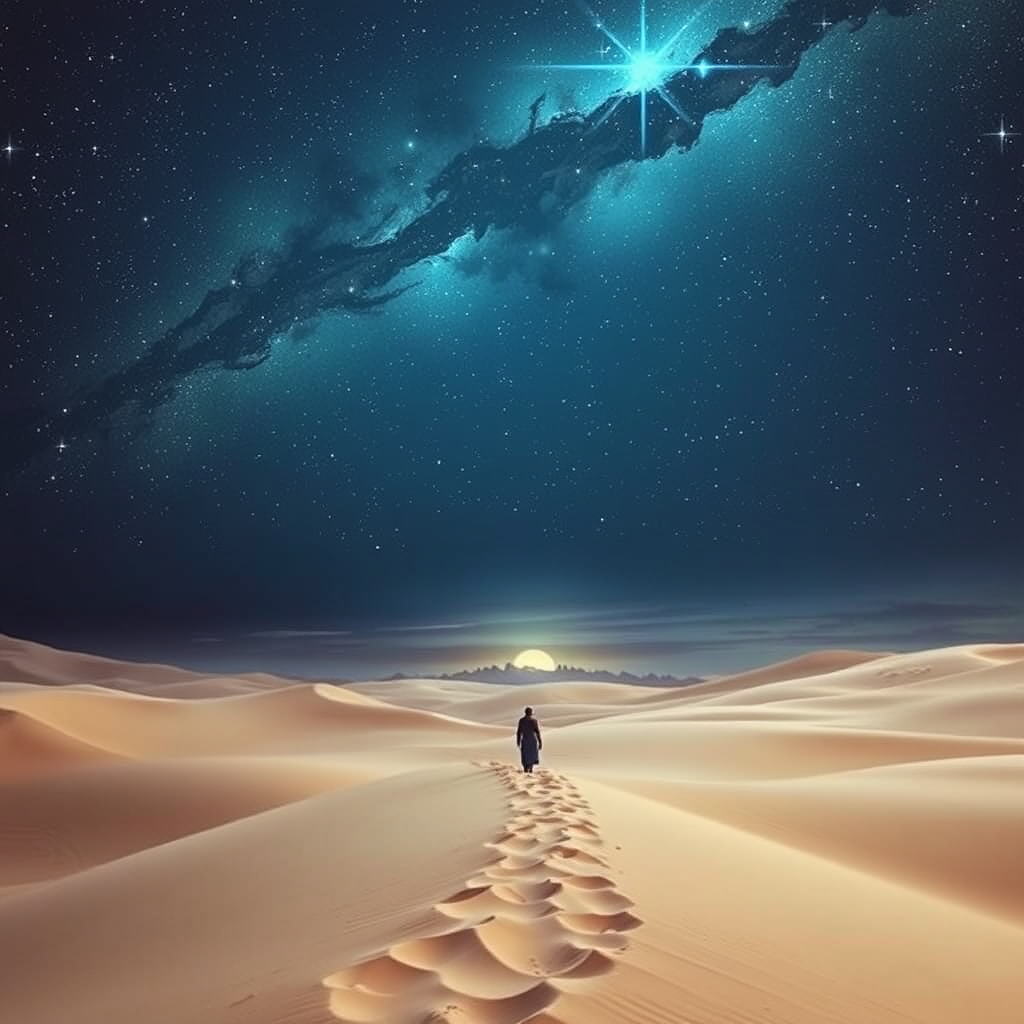 Voyage across a sprawling, starlit desert where sand dunes whisper ancient secrets and guide travelers towards a mystical oasis hidden within the dunes, where time flows differently and celestial events paint the sky with colors unseen by human eyes.