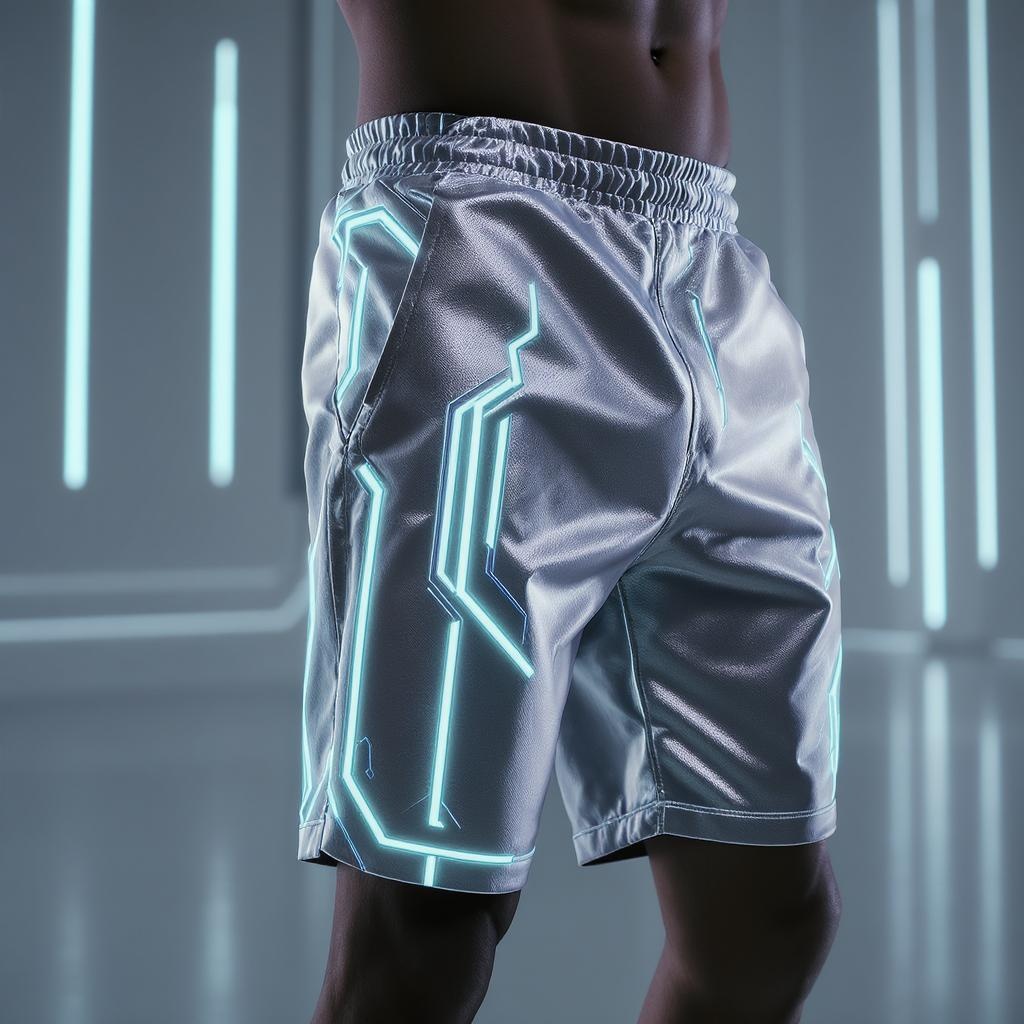 Vuori-inspired Tron summer collection featuring Tron-style core shorts, captured with a Sony a7i for high-definition clarity, showcasing crisp details and sleek lines with a futuristic aesthetic.