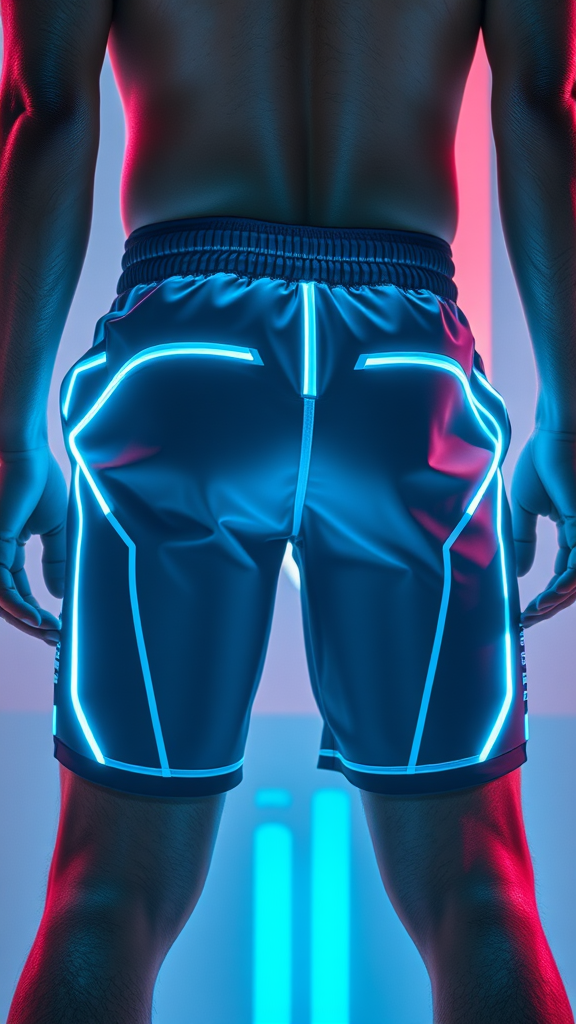 Vuori x Tron Summer Capsule, futuristic athletic shorts, shot on Sony A7 III, ultra high-definition, intricate detailing, sleek and modern design.