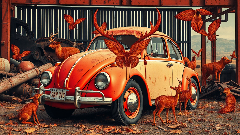 VW Beetle retro poster capturing the essence of rustic charm with a gritty reportage feel, infused with kombuchapunk aesthetics, portraying scenes of rusty debris and hyper-realistic animal illustrations in red and amber hues. Shot with a wide lens for an expansive view, the composition brings together elements of nostalgia and modern edge, evoking a sense of timeless adventure -vintage journey through nature's lens.