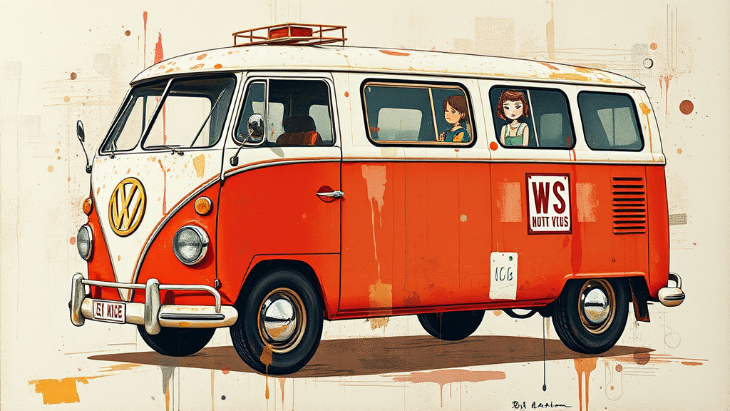 VW bus canvas artwork featuring a blend of abstract art print styles reminiscent of Brian Mashburn and Theo Prins, infused with light red and light brown hues. The piece includes charming character illustrations inspired by Pierre Pellegrini and a vintage cut-and-paste aesthetic, incorporating elements of rusty debris for an added layer of texture and intrigue, maintaining a creative allure within its dimensions.