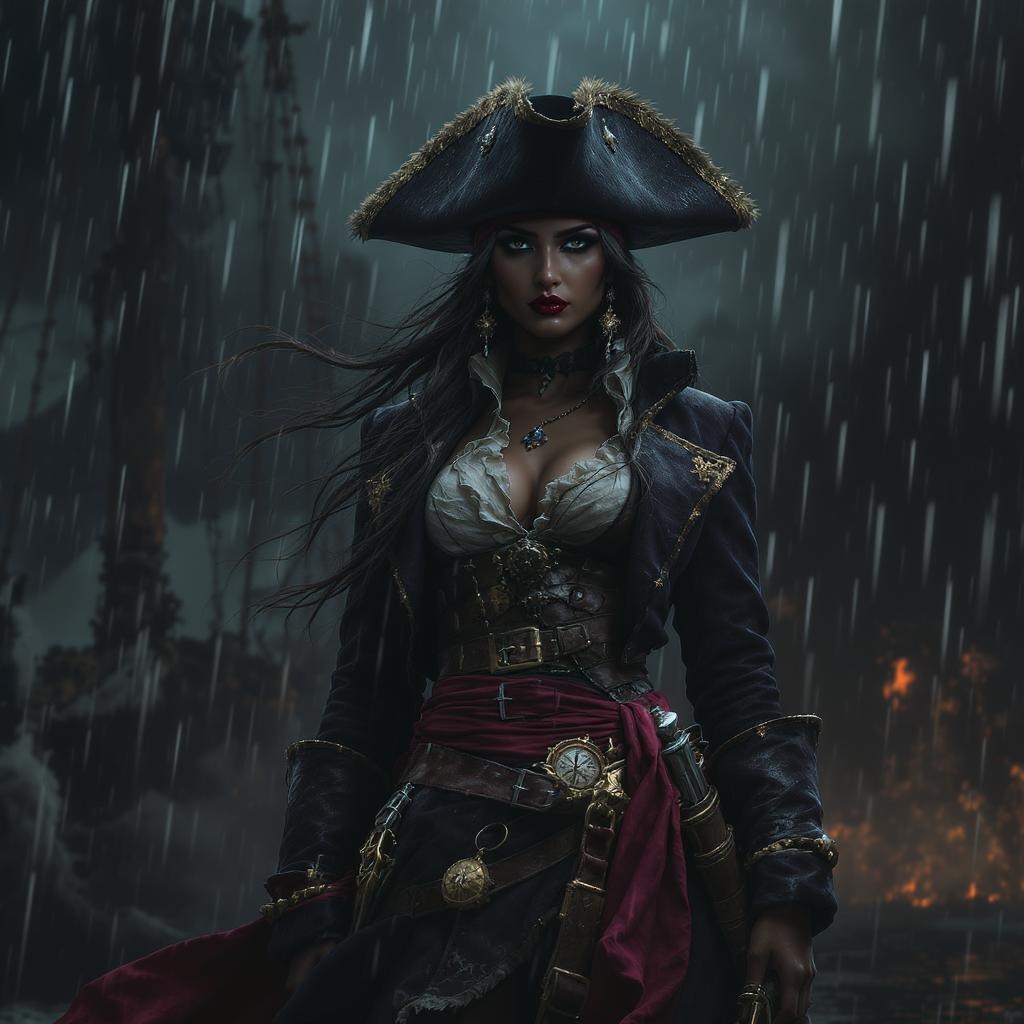 Waist-length body shot of a lady pirate in a tempestuous weather backdrop, thick atmosphere, drenched, shadowy, eerie, light brown skin with Middle Eastern features, alluring and mysterious, exquisitely detailed pirate attire, sophisticated and elaborate pirate accessories, highly detailed, photorealistic with an octane render quality, cinematic with a touch of cinematic noise, dramatic essence, professional photography lighting, depth of field focus, intense light and authentic shadow play, of movie-quality rendering, with vfx post-processing and advanced ray tracing lighting, capturing a dynamic and evocative scene.
