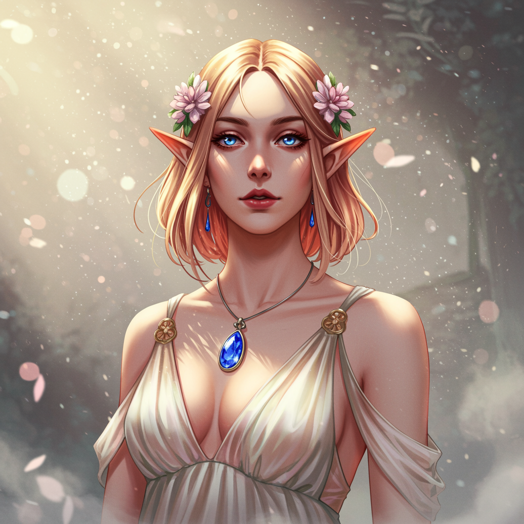 waist-length portrait of a female elf with delicate, slender features, adorned with a sapphire pendant, dressed in a luminescent gown with sheer straps, gazing directly at the viewer, exquisitely detailed digital artwork reflecting artstation standards, concept art by artgerm, greg rutkowski, and influenced by alphonse mucha, ultra-high definition 8k resolution, enveloped in ethereal mist, with gentle bloom and light rays casting a magical ambiance, enhanced by intricate bokeh effects.
