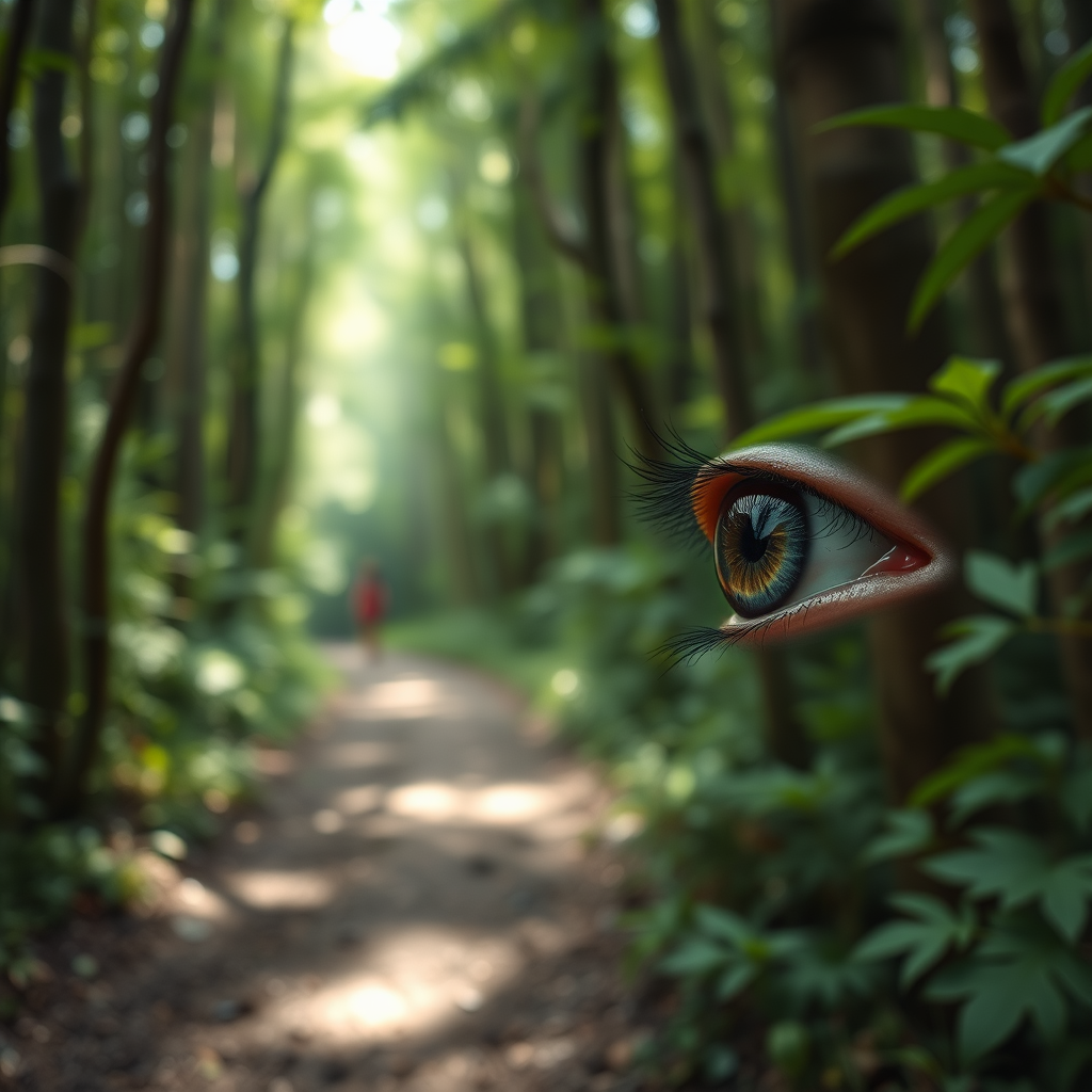 Walking through a lush forest, capturing the intricate details of beautiful eyes in a professional close-up. With high detail RAW color and cinematic lighting, this ultra-high-resolution scene evokes a physics-based rendering that feels like a seamless blend of CG and reality, ideal for an 8K wallpaper. The imagery excludes any elements of low resolution, jpeg artifacts, or unintended distortions, ensuring the anatomy and proportions are accurate and harmonious, free from mutations or errors.