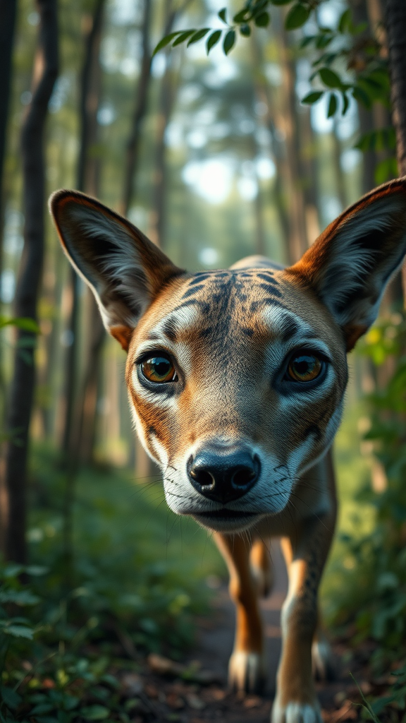 Walking through the forest, captivating and beautifully detailed eyes, high-detail color photo with a professional close-up look, ultra-high-resolution and highly detailed CGI unified 8K wallpapers, featuring physics-based rendering and cinematic lighting. The scene captures the essence of a realistic 3D environment, excluding low-quality and erroneous elements like text errors, poor resolution, or image artifacts. It focuses on maintaining aesthetic integrity, avoiding any depiction of disfigurement, incorrect anatomy, or unnatural features, ensuring a harmonious and visually appealing composition without extraneous elements such as watermarks or signatures.