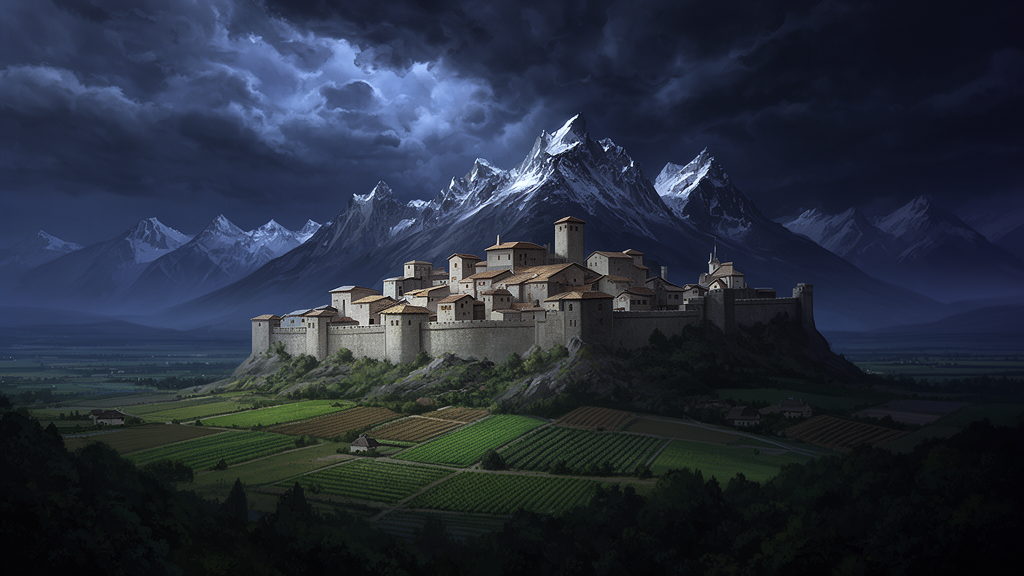 A professional, stylish illustration of a walled fantasy city sitting on a mountain plateau surrounded by farmland and forest below. In the background there are tall mountain peaks capped by snow. The scene is at night, with heavy storm clouds in the sky. The city houses are made of stone and plastered walls with low angled roofs.