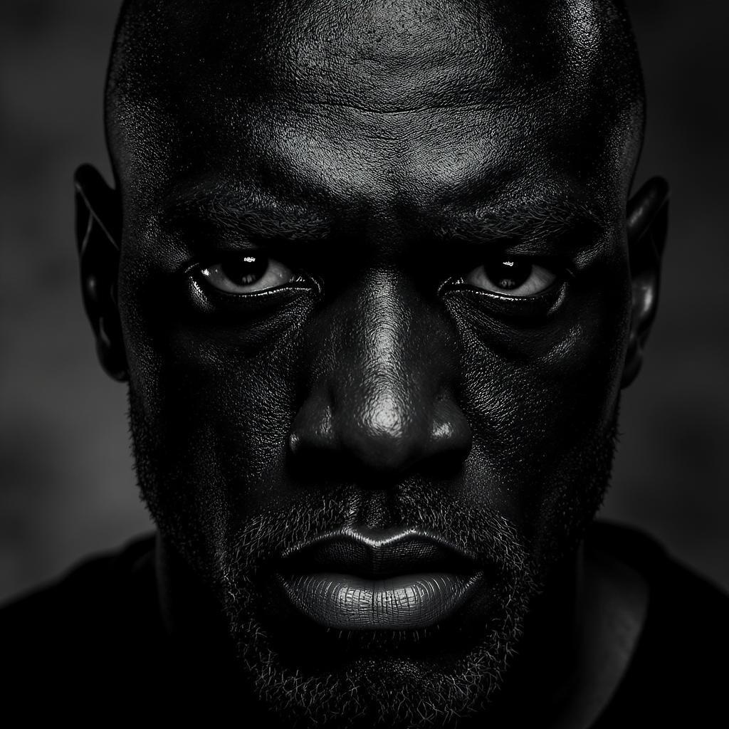 Wallpaper featuring a high-resolution photo of a black man gazing intensely at the camera, extreme close-up, monochrome style, captured with a Leica 50mm lens at f1.4, showcasing intricate details and textures in the skin and eyes, with dramatic lighting that enhances the depth and contrast.