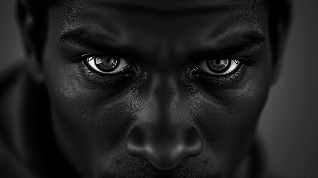 wallpaper high resolution image of black man intense gaze direct eye contact extreme close-up monochrome aesthetic captured with a Leica 50mm lens at f1.4 subtle artistic modifications and nuances maintained