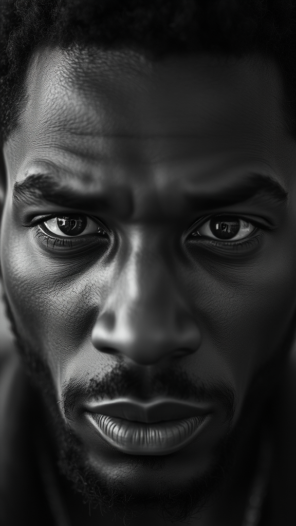 wallpaper high texture quality portrait of a black man gazing intently at camera close-up black and white captured with Leica 50mm lens at f1.4 subtle creative lighting enhancements