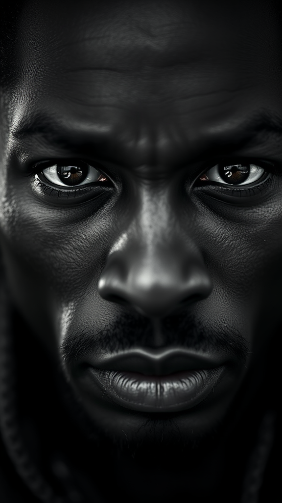 Wallpaper high texture quality portrait of a black man gazing directly into the camera, intense close-up, monochrome, shot with a Leica 50mm lens at f1.4, slight vignette for dramatic effect.