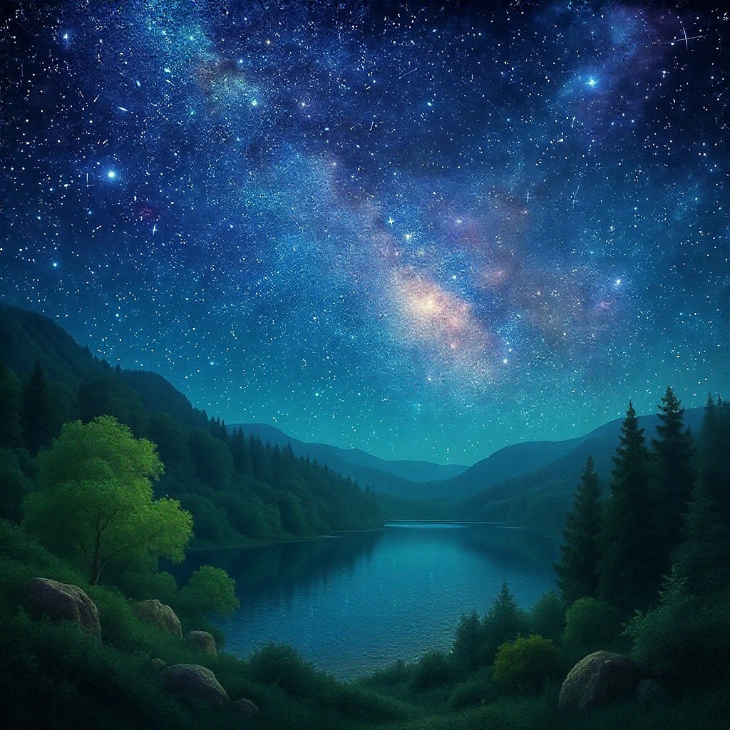 View this AI-generated image featuring a celestial themed wallpaper featuring an ethereal landscape where lush forests and serene lakes coexist under a night sky adorned with shimmering constellations and swirling cosmic nebulae creating a harmonious blend of nature and the astral realm. Created usi