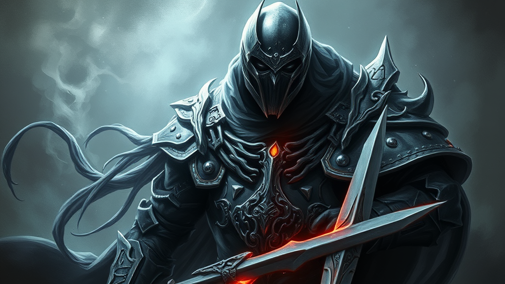 Wallpaper portrait of a legendary ghost knight, exuding power and invincibility, portrayed as unstoppable and brutal. The composition is epic, crafted as a digital painting with dramatic, gloomy elements and emotionally profound depth. Volumetric lighting casts intense and brooding dark tones, leaving a haunting and indelible impression on the psyche. The artwork is high quality and high-resolution, emphasizing a spectral presence and achieving visual impact. Duplications, poor anatomy, misplaced limbs, unnecessary text, names, signatures or watermarks are avoided, ensuring clarity and artistic integrity without jpeg artifacts.