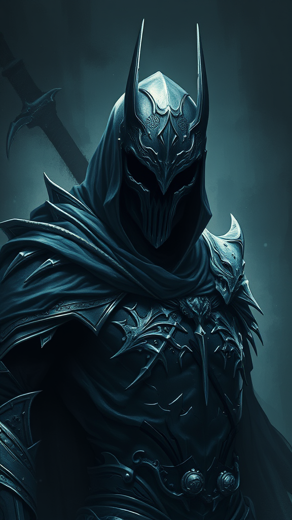 wallpaper portrait of a legendary phantom knight, formidable, indomitable, relentless, fierce, epic composition, digital painting, dramatic, somber, emotionally profound, volumetric lighting, intense and brooding dark hues, leaving a deep and haunting impression on the psyche, high quality, high resolution, otherworldly presence, captivating, skillfully depicted anatomy, atmospheric, devoid of clutter, no text or signatures, pristine image quality.