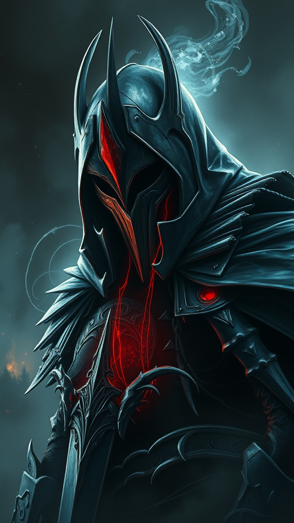 Wallpaper portrait of a mythical ghost knight, exuding power and invincibility, an unstoppable force cloaked in brutality, featuring epic composition in digital painting, dramatic and gloomy atmosphere, emotionally profound with volumetric lighting, enveloped in intense and brooding dark tones, leaving a haunting and unforgettable impression on the psyche, high quality and high resolution, with meticulous attention to detail.