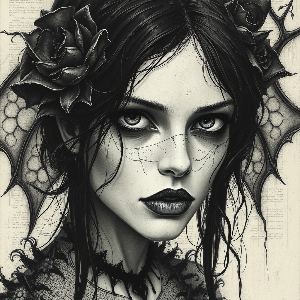Walpurgis Night::5 Cybergothic Charcoal Portrait::4 imaginative, expressive, intricate, textured, traditional medium, charcoal, premium paper, exclusive edition, critically acclaimed, by Ross Tran, Antonio J. Manzanedo, Alberto Vargas, dynamic lines, shaded nuances, meticulous detailing::3 distorted, inaccurately rendered, lack of intricacy, unnatural shading::-2