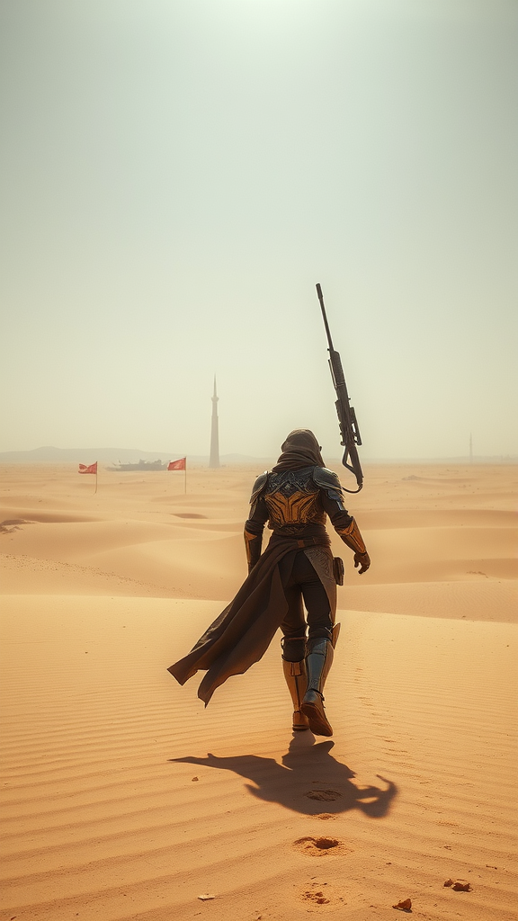 Wandering sentinel in a dystopian future, a lone figure strides through the endless expanse of a barren desert wasteland, a guardian of order amidst chaos. Clad in intricately forged armor gleaming under the harsh sun, this desert peacekeeper commands a presence of authority. Armed with an advanced energy rifle emitting a soft, ominous glow, they stand ready to uphold justice in the lawless sands. The vast, open desert stretches infinitely in all directions, captured with a wide angle, conveying the solitude and desolation of the landscape. A cinematic HDR quality brings the scene to life, with every grain of sand, crease in armor, and shimmer of heat waves rendered in stunning 8k detail.