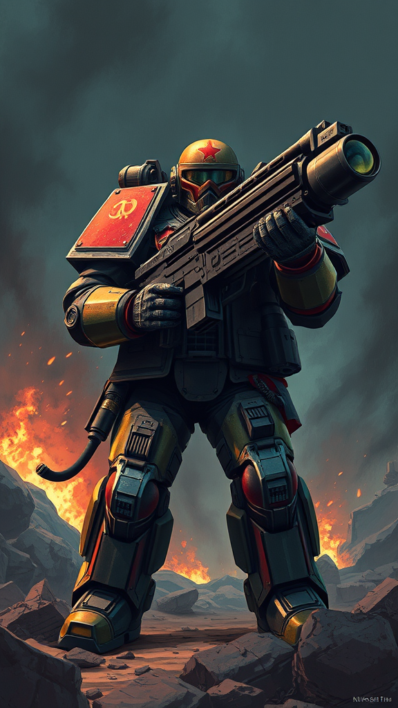 Warhammer-themed Soviet soldier wielding a gigantic futuristic gun, clad in an advanced sci-fi suit. The scene is set in a retro-futuristic environment, evoking the USSR era fused with elements of anime and manga artwork. The visuals are steeped in dark, moody colors with the intricate detail of high-res offset printing. Capture this dynamic tableau in the style of a vintage poster, rendered in stunning 8K resolution with natural lighting to enhance the soldier's formidable presence.