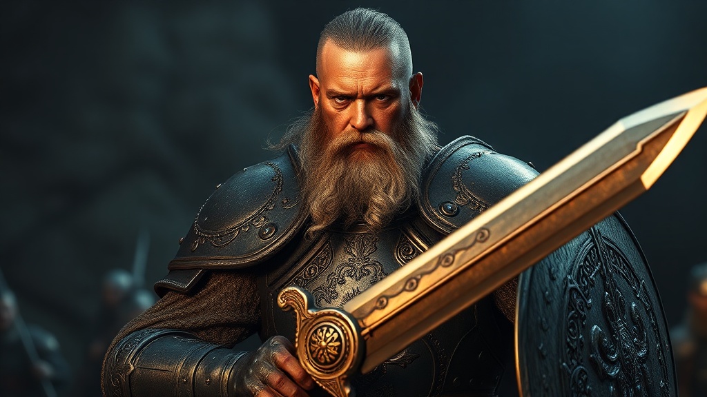 A seasoned warrior with a grizzled beard stands on the battlefield, his plate armor gleaming in the dim, dramatic light. He wields a massive sword, poised for combat. The intricate engravings on his armor tell tales of countless battles fought and won. His eyes, sharp and focused, convey a deep resolve. The scene is vivid and cinematic, capturing the essence of hyperrealism, with every detail meticulously rendered in stunning 8k resolution, evoking the tension and intensity of the impending clash.