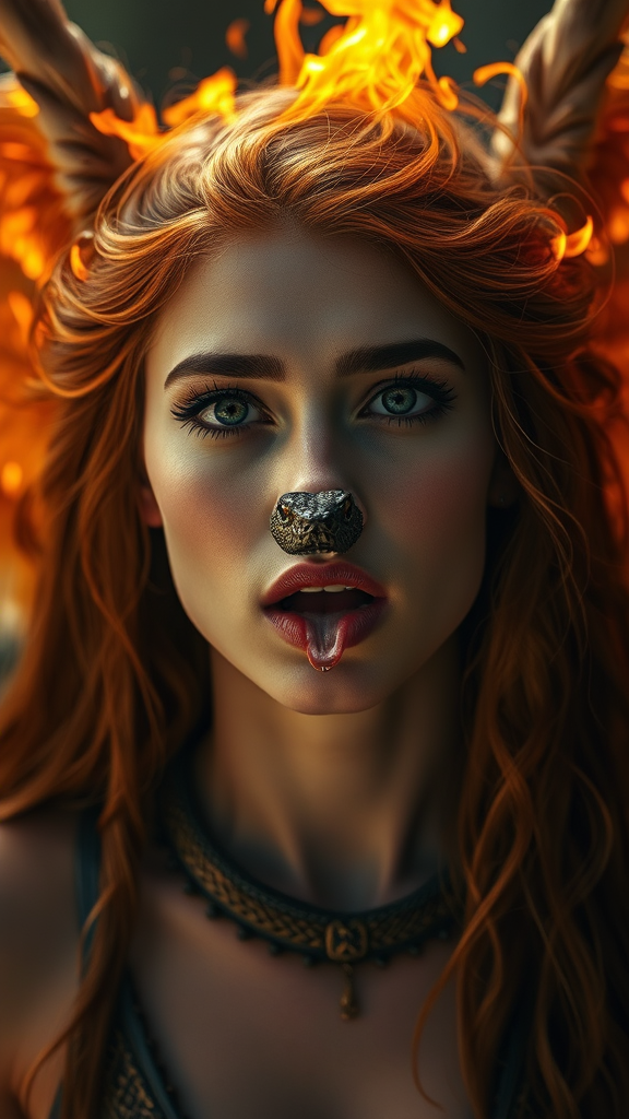 warrior goddess, angelic face, fiery hair blazing like a living flame, mouth agape revealing the head of a snake emerging from within, large expressive eyes, full-body portrait, her skin smooth and luminous, captured in a magical photograph, dramatic lighting enhances the scene, photorealistic detail, intimate cinematic portrait composition, gentle tonal balance, 9:16 aspect ratio