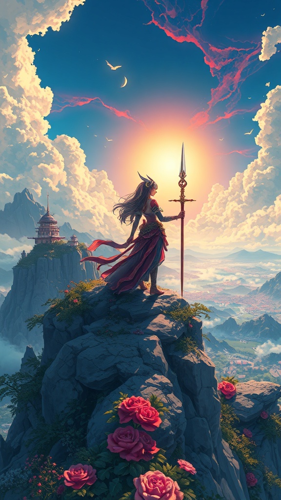 View this AI-generated image featuring warrior goddess poised majestically on a hilltop centered in a stunning anime style art piece serving as a key visual the illustration is intricately detailed breathtaking in its execution and vibrantly colorful offering a panoramic and cinematic view influence