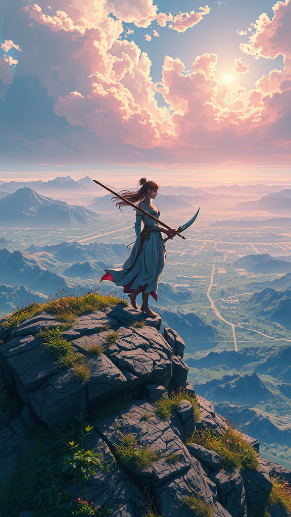 Warrior goddess poised on a hilltop, solitary and regal, captured in anime style as a key visual. The scene is intricately detailed, blending breathtaking artistry with vibrant hues. The panorama is cinematic, echoing the signature touches of Carne Griffiths, Conrad Roset, and Makoto Shinkai. The poster exudes a mesmerizing, detailed allure that draws the viewer into an expansive, awe-inspiring landscape.