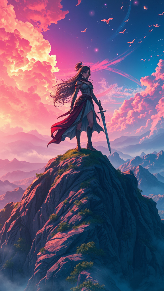 Warrior goddess poster showcasing her majestic presence as she stands alone atop a hill, perfectly centered in the composition, emanating strength and grace. Rendered in an anime style, this key visual exudes intricate and breathtaking detail, with vibrant colors creating a panoramic and cinematic experience. The artwork draws inspiration from the styles of Carne Griffiths, Conrad Roset, and Makoto Shinkai, blending fluid linework, expressive textures, and ethereal lighting for a mesmerizing and immersive depiction of a powerful deity in a grand, expansive landscape.