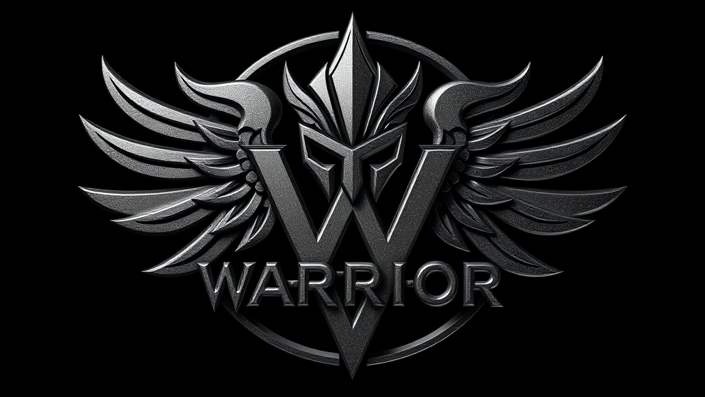 Warrior logo intricately detailed, crafted in black metal with geometric elements, vector-based design emphasizing symmetry and realism, enhanced with ray tracing for depth, black and white color scheme, 8k resolution, square aspect ratio, sophisticated yet bold visual appeal without incorporating the letter V.