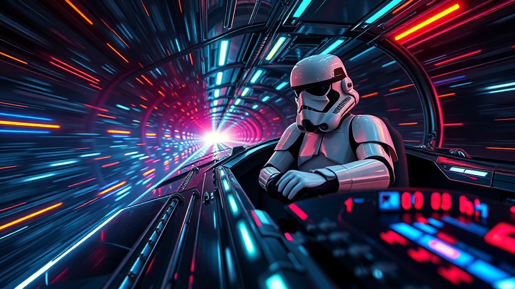 A Star Wars Stormtrooper navigates a spaceship cruising at the speed of light through the vastness of outer space, colorful neon light reflections dancing across the sleek surfaces, with sophisticated reflection mapping showcasing the intricate design and exquisite details. The scene is enveloped in dramatic lighting, capturing hyperrealism with cinematic flair, rendered in stunning photorealistic 8k quality, akin to an Unreal Engine masterpiece, with an aspect ratio of 9:16 and a style setting of 750.