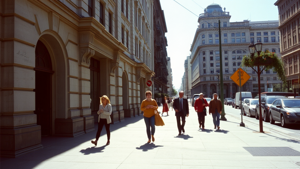 Watec cassette tape recorded sounds of San Francisco city streets amidst a Kodak ektachrome film photo of pedestrians walking under bright daylight on a concrete sidewalk lined with historic federalist era buildings