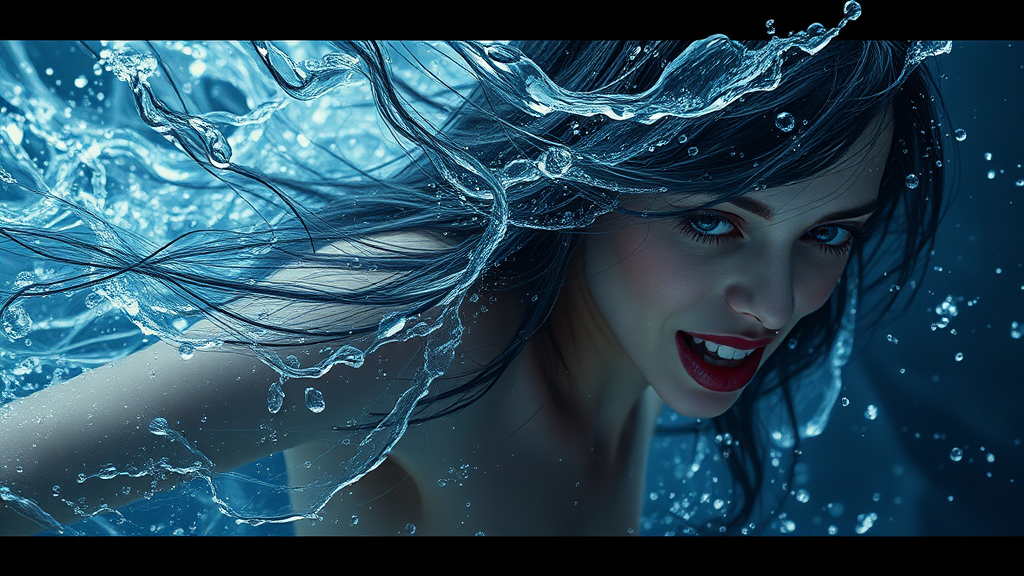 Water texture for Autodesk animation featuring a female Genesis 2015 model, water texture cascading over hair, inspired by Howard Schatz, with dynamic and energetic gestures echoing Frank Miller's dramatic style, showcasing a fully transparent body with luminous suffusion reminiscent of Philippe Druillet, captured with the cinematic depth of 70mm film, aspect ratio 4:5, style raw, vibrancy set to 6.0.