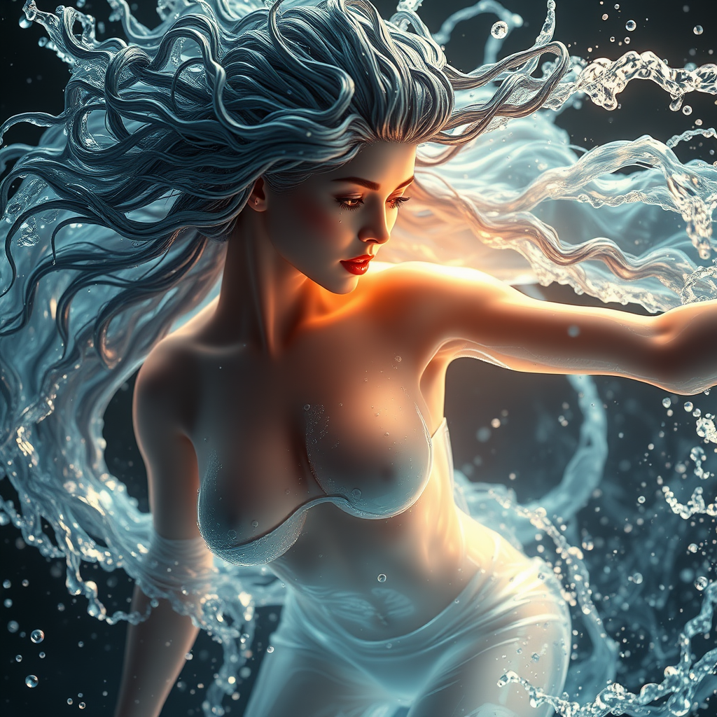 Water texture for Autodesk animation, female genesis 2015, flowing water texture for hair, inspired by Howard Schatz, dynamic and energetic poses, reminiscent of Frank Miller, fully transparent body with luminous glow, echoing Philippe Druillet's style, shot on 70mm film, aspect ratio 4:5, sharpness level 50, version 6.0, raw cinematic style.