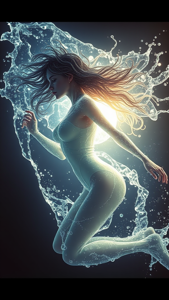Water texture for Autodesk animation female genesis 2015, water effect for hair, inspired by Howard Schatz, dynamic gestures, reminiscent of Frank Miller, fully transparent body, luminous glow, echoing Philippe Druillet, captured in 70mm, aspect ratio 4:5, style raw, subtle creative enhancements.