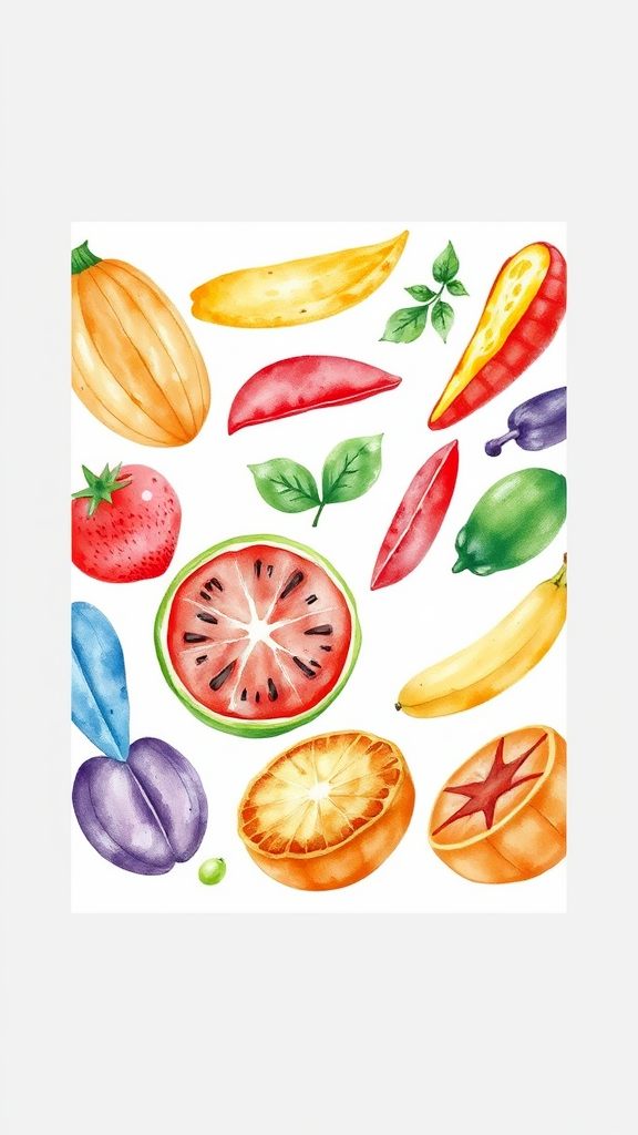 Watercolor illustration of various food items, set against a clean white background with vivid colors and delicate textures, no shadows, emphasizing freshness and artistic flair.