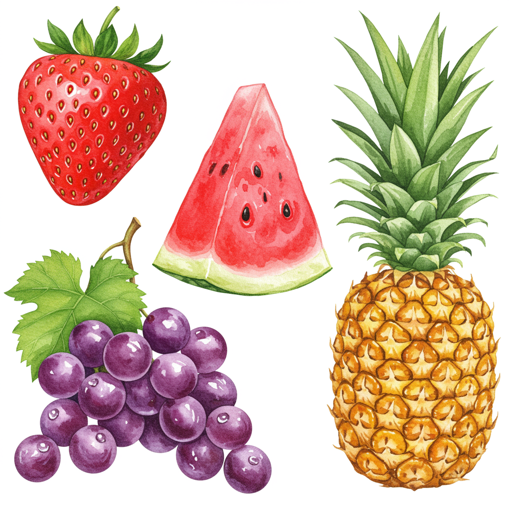 Watercolor illustrations of various foods, each vividly detailed and isolated on a clean white background, free from any shadows, highlighting the vibrant colors and textures of the ingredients.