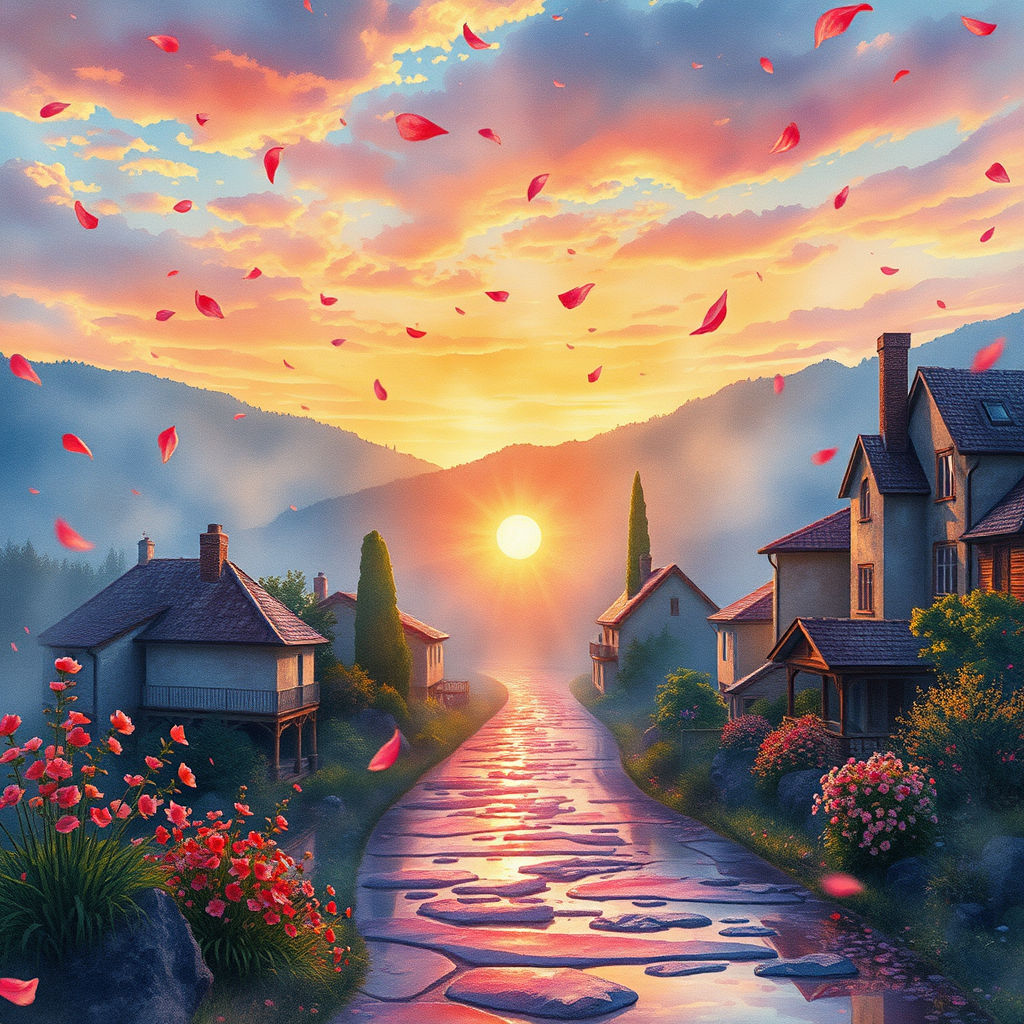 Watercolor landscape at sunrise, petals gently falling like rain, capturing a village scene reminiscent of art by Daniel Merriam, Josephine Wall, and others known for their intricate and vibrant work. The scene is infused with a wet-on-wet watercolor approach, creating a dreamy patchwork of colors and forms. The reflection is holographic, with a glossy, shimmering effect that is cinematic and smooth, offering super clear resolution with dynamic lighting. The view is hyperdetailed and realistic, emphasizing a fantastic perspective in 8k UHD HDR quality. The landscape is intricately detailed, with crispy quality and a harmonious fusion of elements, capturing a breathtaking and immersive experience without flaws or distractions.