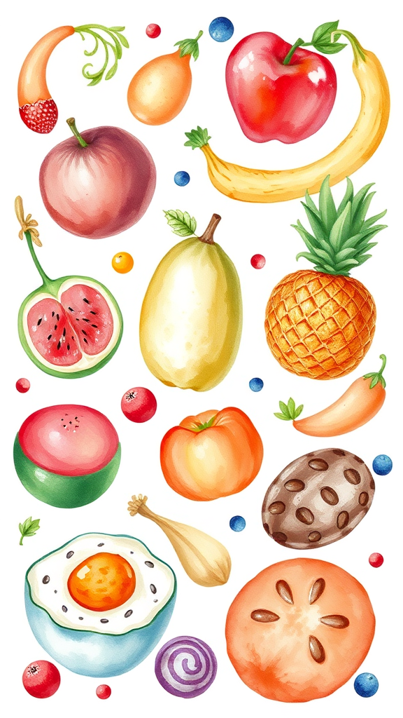 Watercolor painting of various foods as clip art, featuring vibrant colors on a white background with no shadows, --q 3 --v 4