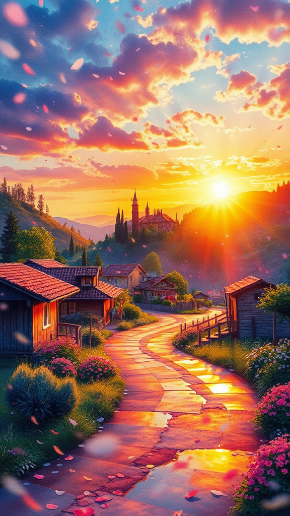 Watercolor sunrise scene with wet-on-wet technique, depicting a village landscape under a shower of petals, inspired by artists like Daniel Merriam, Josephine Wall, and Alena Aenami. The scene incorporates elements of holographic reflections and glossy, shimmering surfaces for a cinematic and realistic effect. This intricate and highly detailed artwork captures the dynamic lighting of sunrise, offering a fantastic view in 8k UHD HDR quality, ensuring a super clear and crispy resolution. The image remains free from distortions such as disfigured or mutated elements, maintaining a realistic portrayal without low-resolution issues, watermarks, or artifacts.