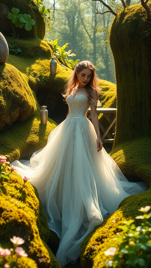 Wearing an enchanting gown amidst a lush landscape of moss, flowers, and clovers, the scene is bathed in gentle sunlight, creating a dreamy ambiance. The composition is intricate and highly detailed, with sharp focus that enhances the beauty of the setting. The colors are professionally graded, resulting in a masterpiece quality that could be trending on art platforms. Presented in HDR 4k and 8k resolutions, the image features a captivating depth of field and high contrast. The whimsical narrative is free of distortion, maintaining perfect anatomy and clarity, ensuring every element is in the frame, with crisp, well-drawn features and no intrusive text or watermarks.