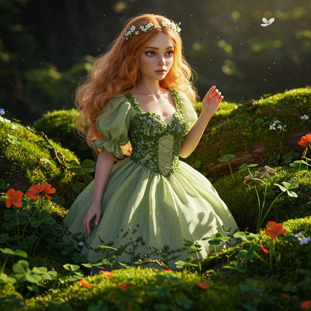 wearing an enchanting gown, surrounded by lush moss, vibrant flowers, and clovers, basking in gentle sunlight, exuding a dreamy atmosphere, showcasing intricate and meticulous details with a sharp focus, professionally color graded, a stunning masterpiece trending on art platforms, presented in hdr 4k and 8k, with a beautiful depth of field and a perfect f/1.8 aperture, high contrast, maintaining a cartoon-like charm without compromising quality, avoiding any disfigured or poorly drawn elements, ensuring precise anatomy, and avoiding errors like cropped elements, additional or deformed fingers, and ensuring no distracting signatures or watermarks.