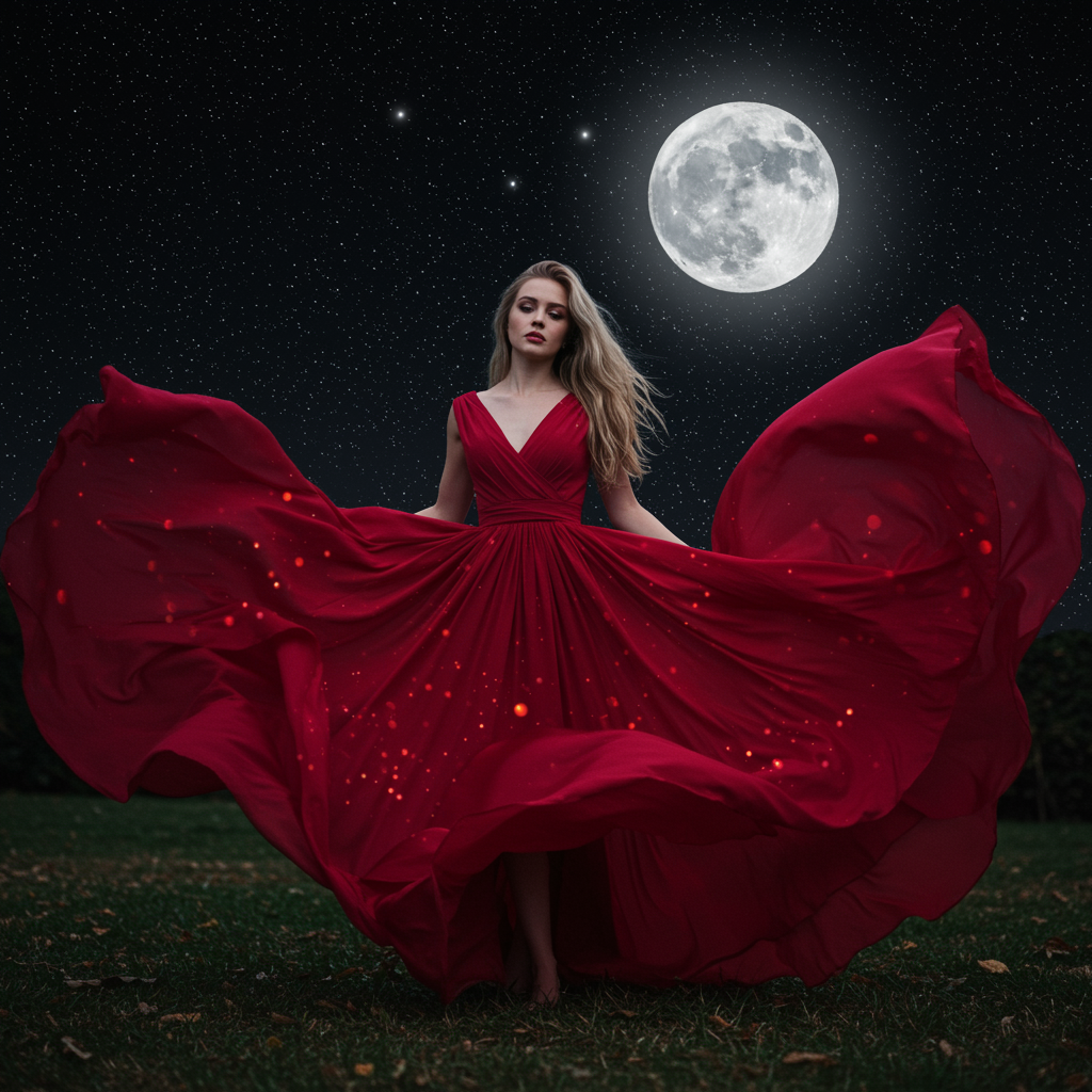 Wearing my crimson gown under the starlit sky, Twirling gracefully in the moon's gentle glow, my hair swept up like a pageant winner, Barefoot and invigorated, dress of shimmering scarlet mist enveloping me --ar 2:1.